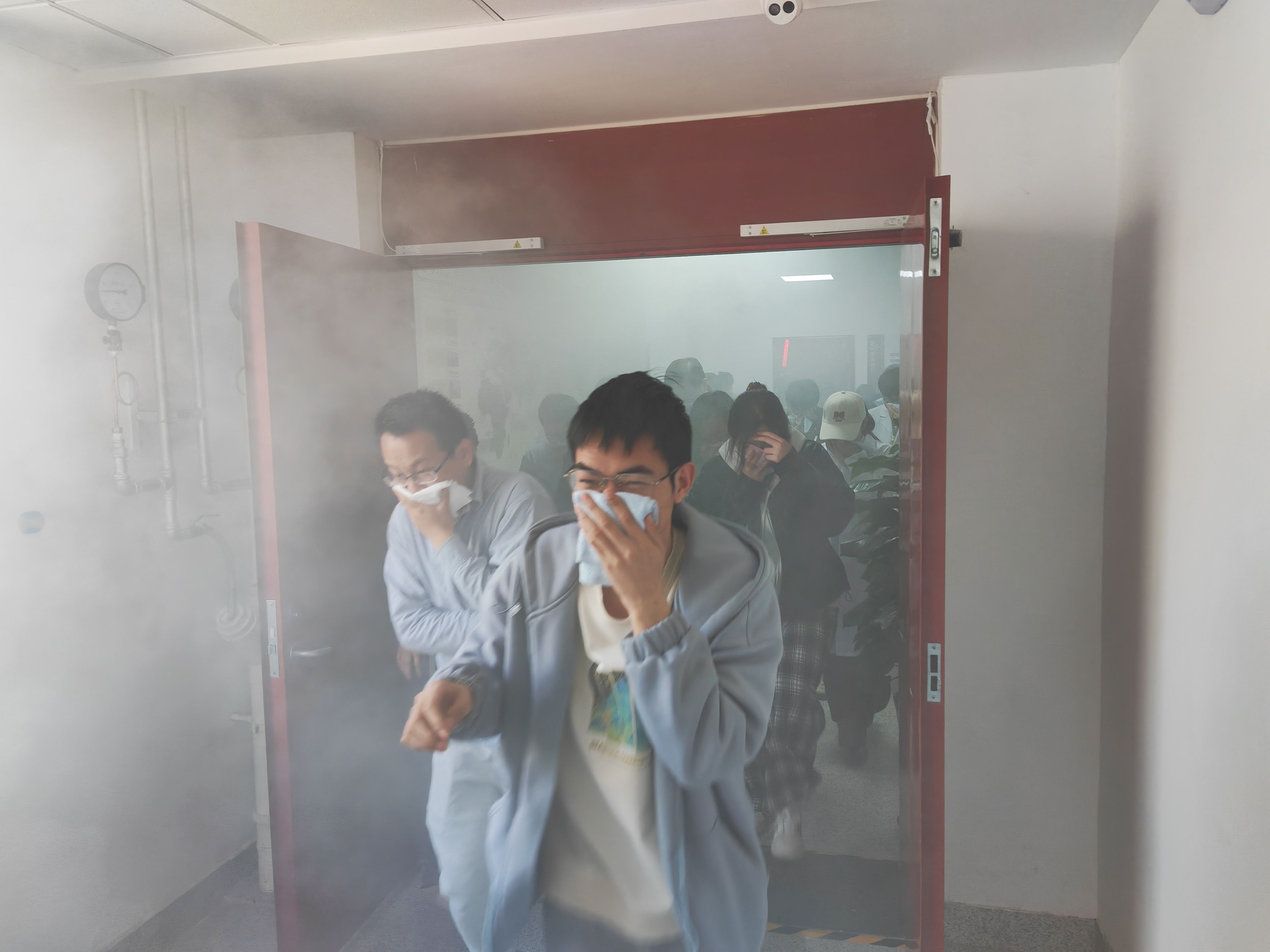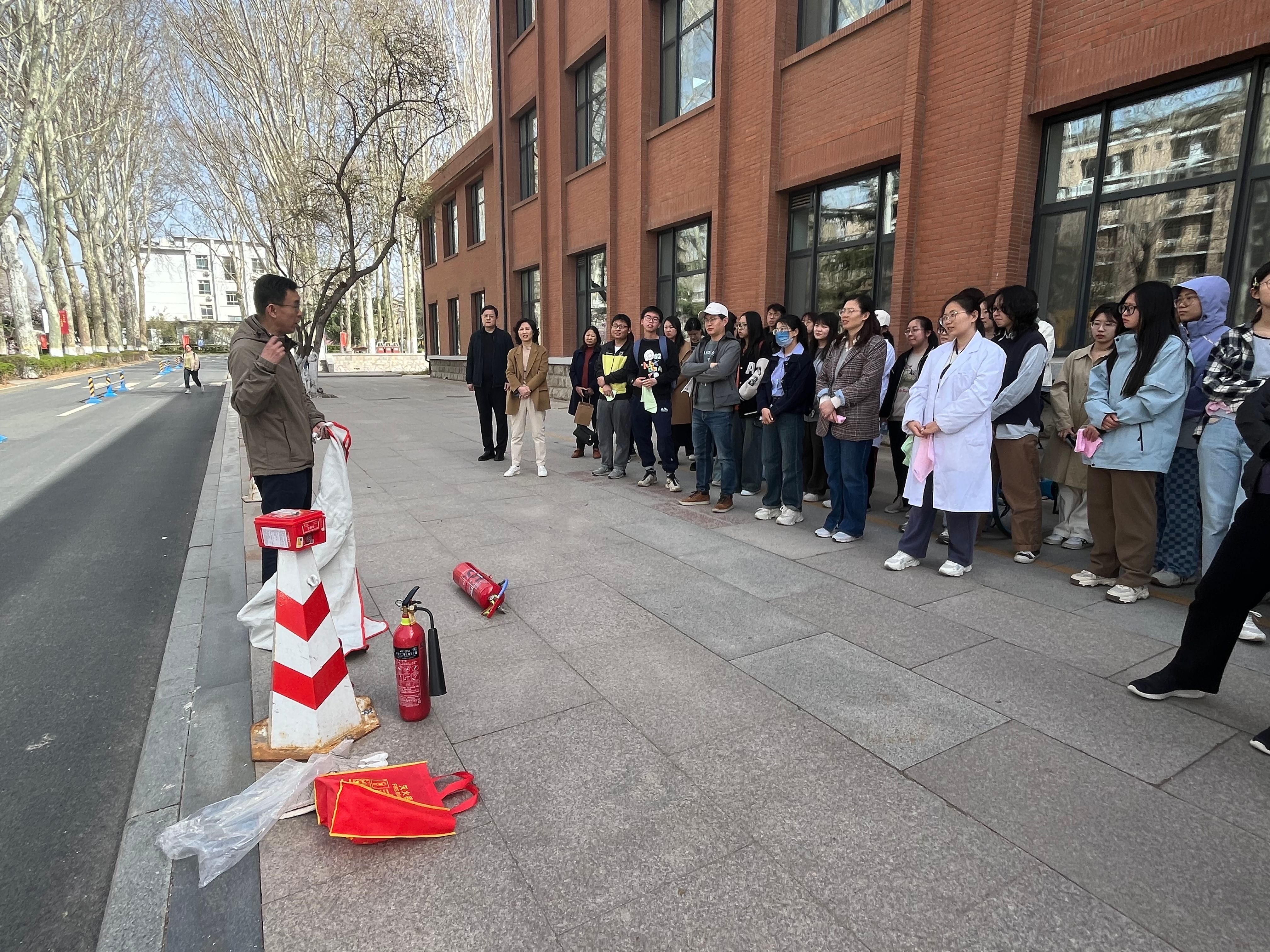 本次活动分为两个阶段。首先,在山东大学党委保卫部的指导下,工作人员点燃烟冰模拟突发火灾事故。随着消防警报声响起,学院按照既定火灾疏散逃生演练预案,迅速组织师生沿安全逃生通道有序撤离。逃生演练结束后,党委保卫部杜春兴科长带领师生回顾了逃生演练过程中存在的问题,强调了火灾逃生过程中的注意事项,如毛巾需打湿后捂住口鼻、陌生环境提前观察逃生疏散路线等,并对学校办公学习场所设置的常用消防设施进行了讲解和演示。