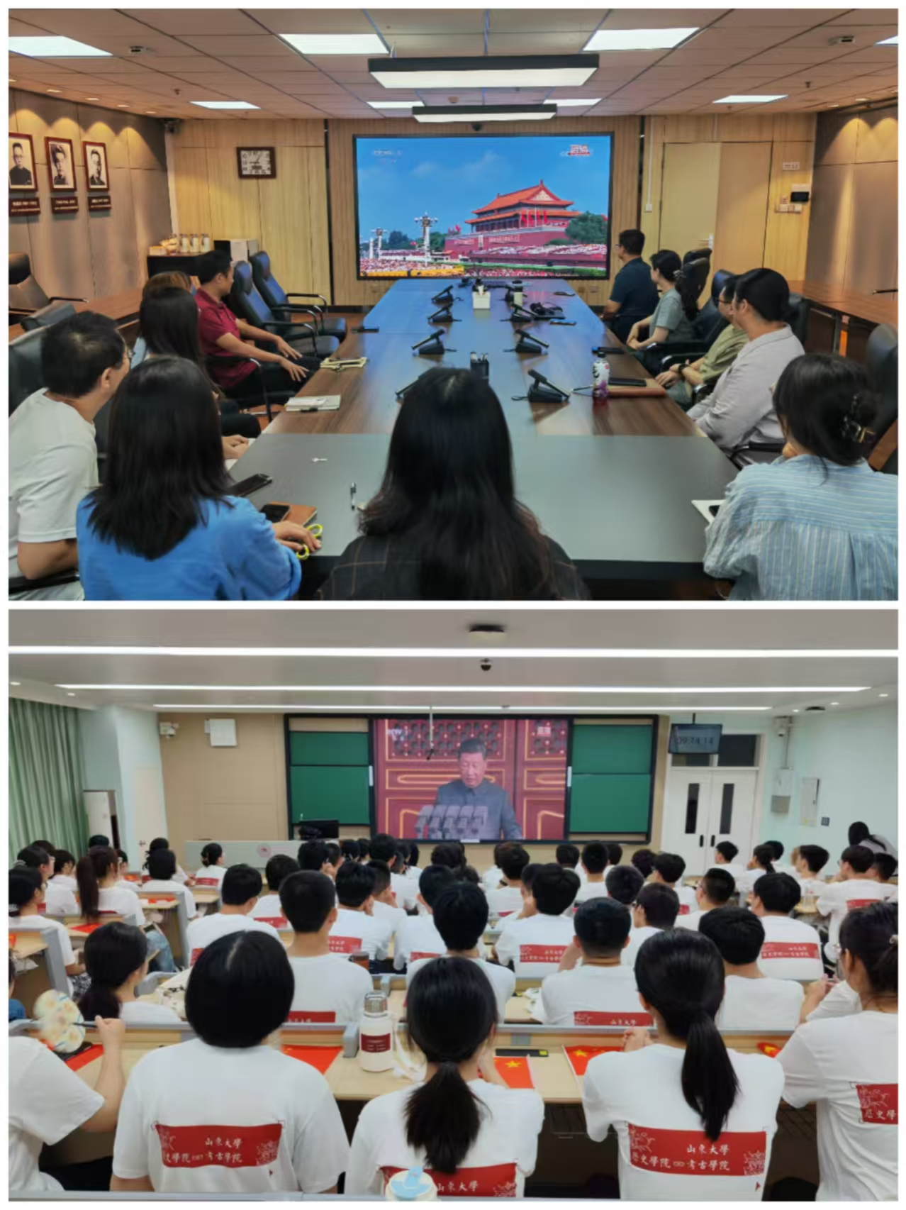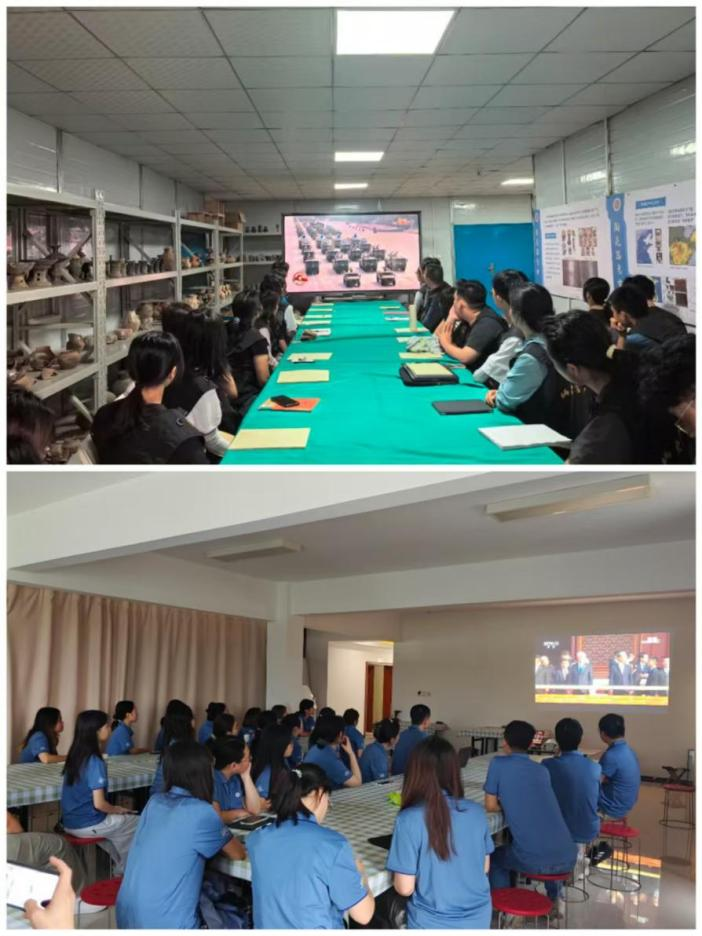 学院组织全体师生观看现场直播,老师和同学们在会议室、教室、考古发掘实习工地等地点通过网络、电视、新媒体等多种形式收看大会实况,形成一堂堂别开生面的爱国主义教育实践课。