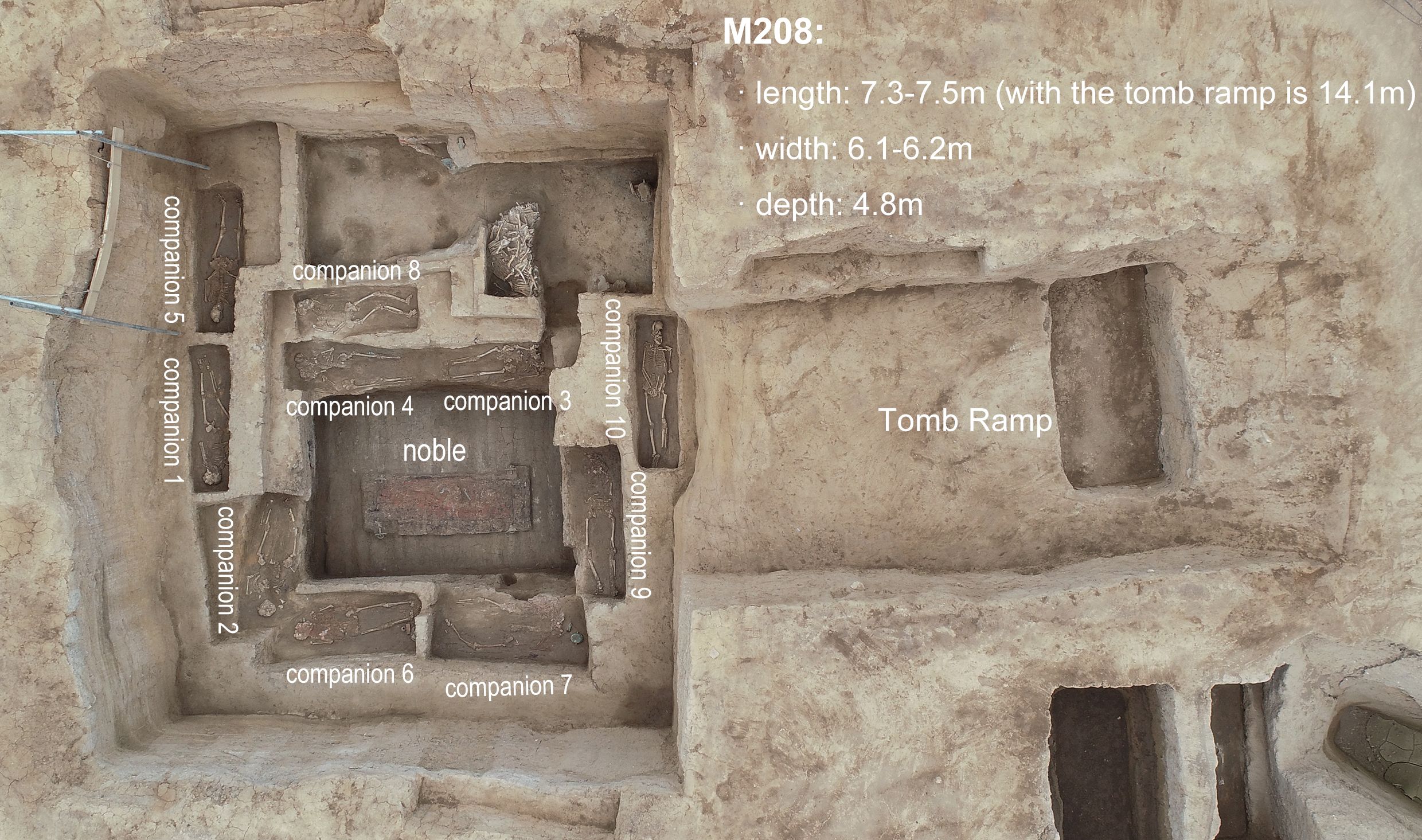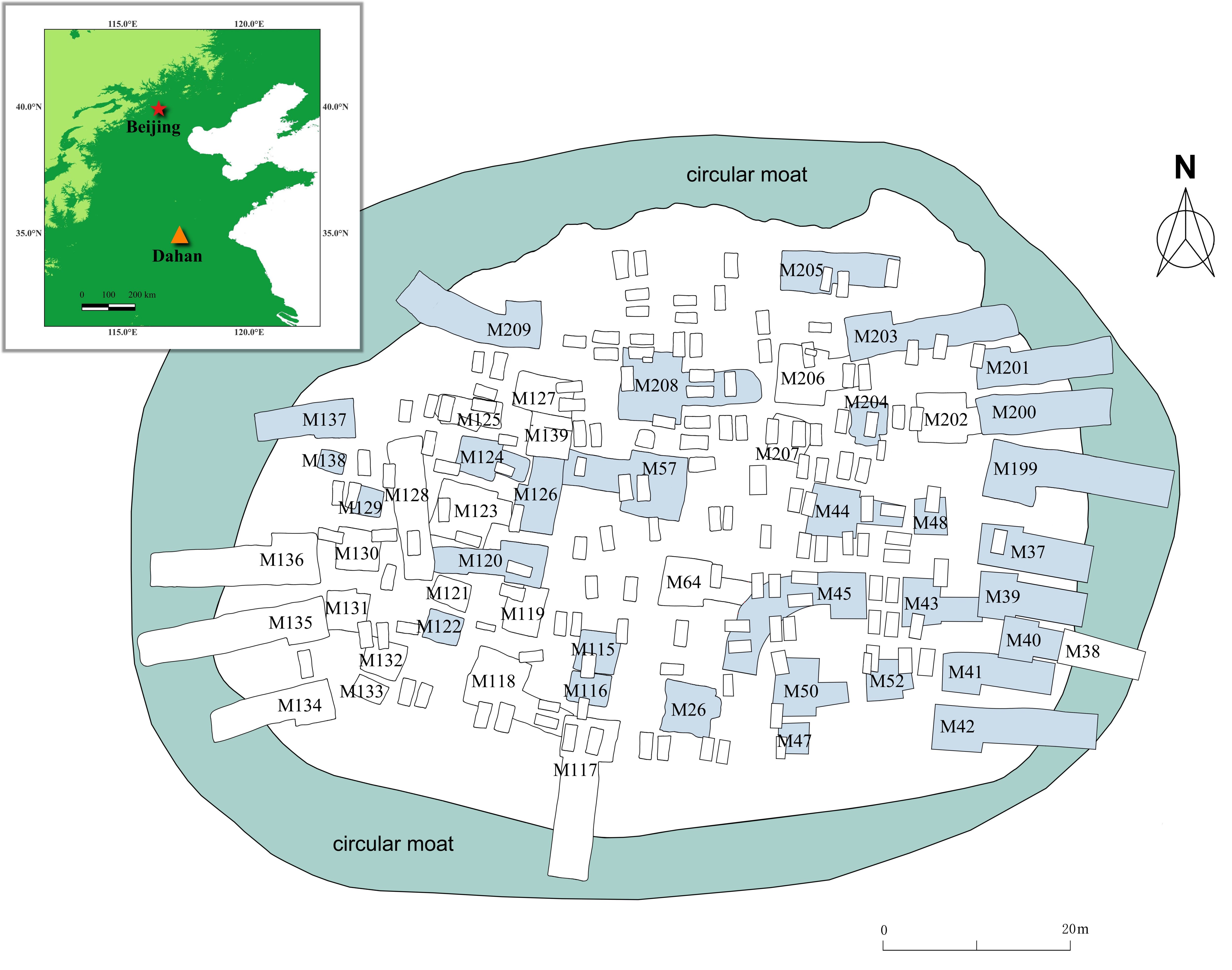 图一 上:滕州大韩墓地位置示意图及平面分布图(研究样本出自蓝色填充墓葬),下:滕州大韩墓地M208