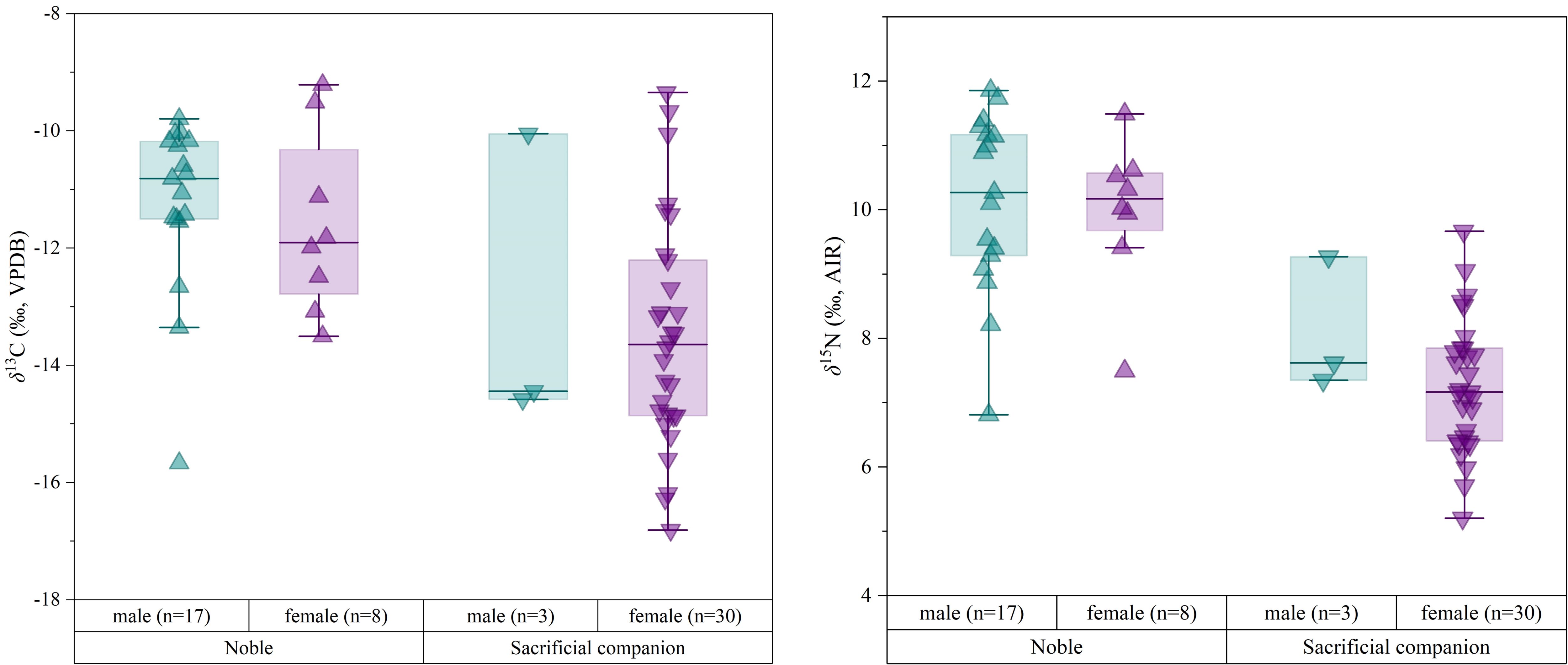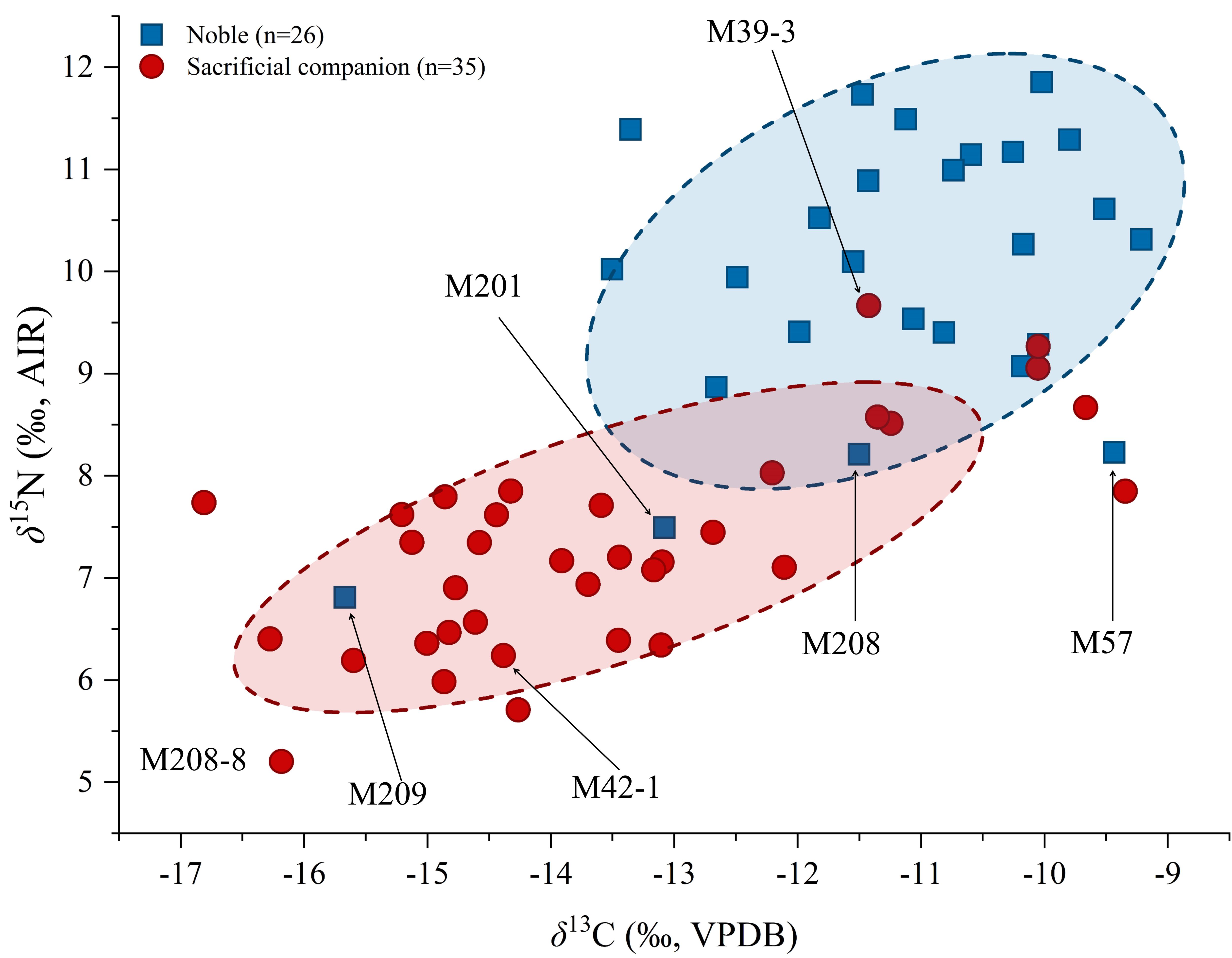 饮食和墓葬分析还表明,部分殉人可能受益于墓主或其社会关系,获得了更多社会资源(如食物),但大多数殉人的饮食和丧葬待遇较差,其社会关系可能与墓主较远。另外,一例贵族男性拥有较低的碳氮同位素值(甚至低于绝大部分殉人),与其丧葬待遇(随葬品较多,包括铜鼎和铜兵器)形成鲜明对比,这或许反映了东周时期的社会流动。这例个体后期可能通过军功提升了社会地位,身份变更后的高质量饮食未能及时体现在骨骼的同位素信号中,但该推测还有待后续更深入研究的证实。