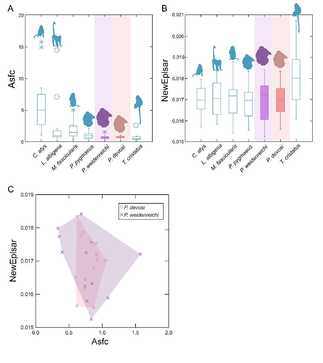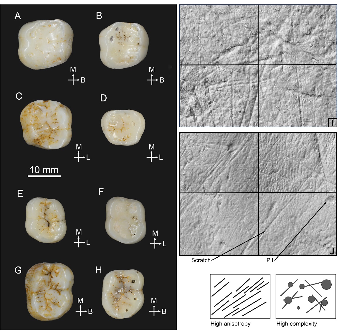 研究团队对25颗不同亚种的化石猩猩臼齿(来自感仙洞的Pongoweidenreichi和中山洞的P. devosi)进行了牙齿咬合面微痕分析,利用共聚焦显微镜(Sensofar Plμ Standard)和尺度敏感分形分析软件(MountainsMap 8)采集表面粗糙度数据,并和婆罗洲现生猩猩及不同食性的现生灵长类的结果进行了统计对比。结果显示,中更新世化石猩猩微痕特征在不同亚种间,以及与现生猩猩间没有显著差异。