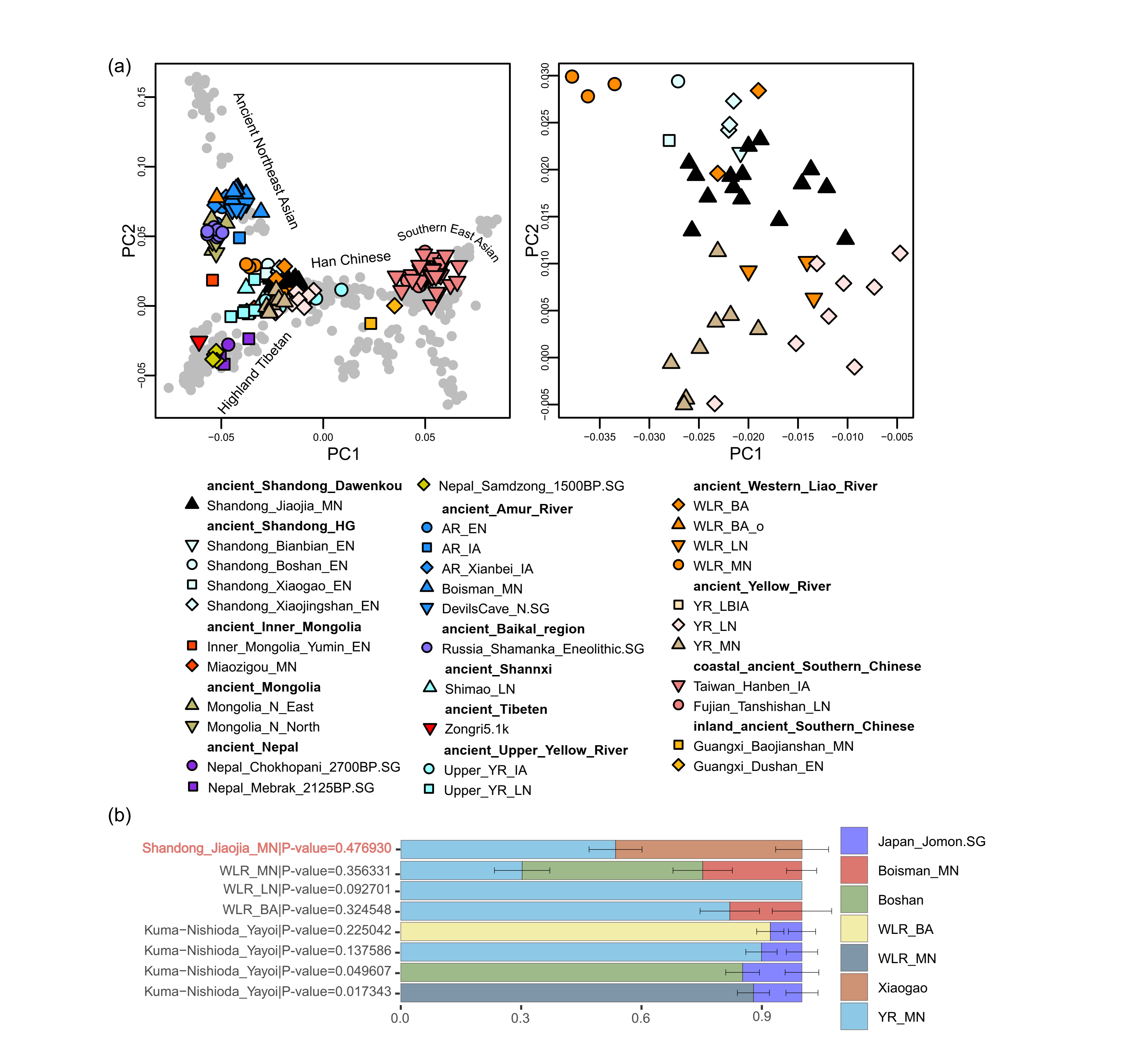 图一 焦家遗址古人遗传分析(a. 主成分分析图;b. 遗传混合分析图)