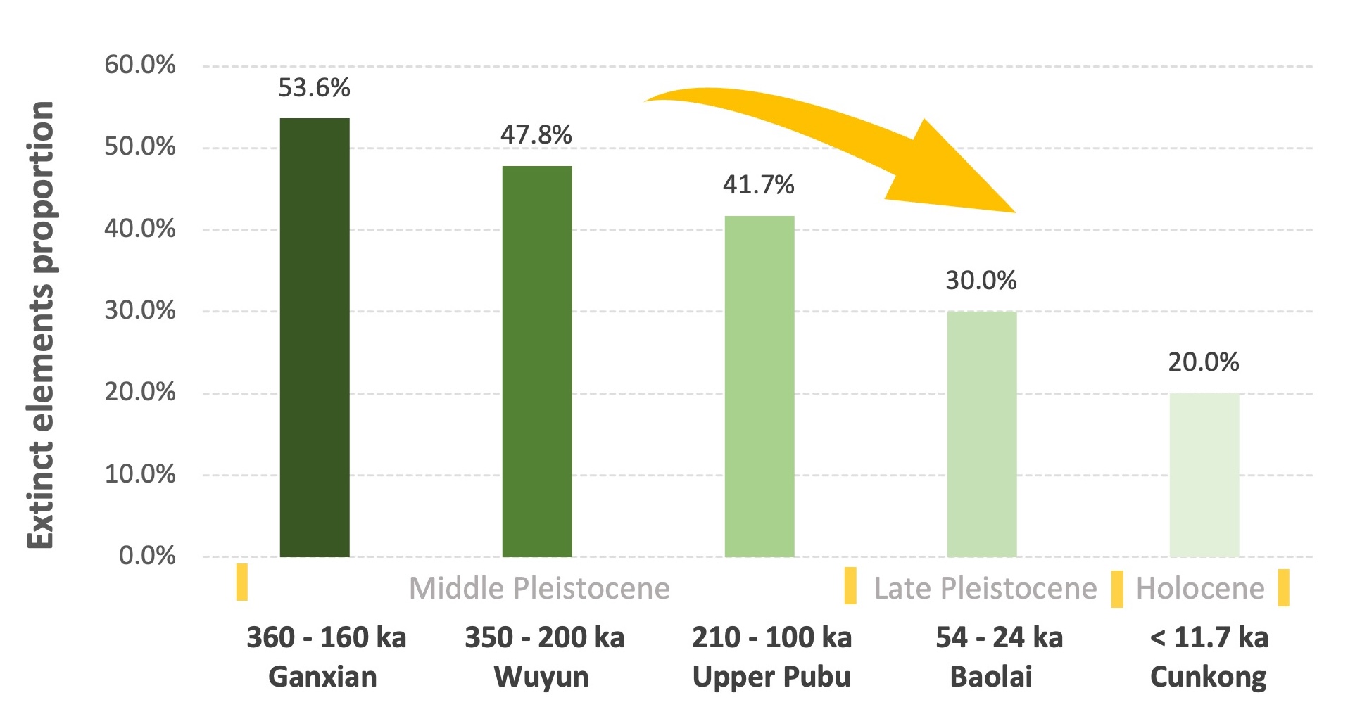 图3 布兵盆地中更新世至全新世动物群中已灭绝物种比例的变化