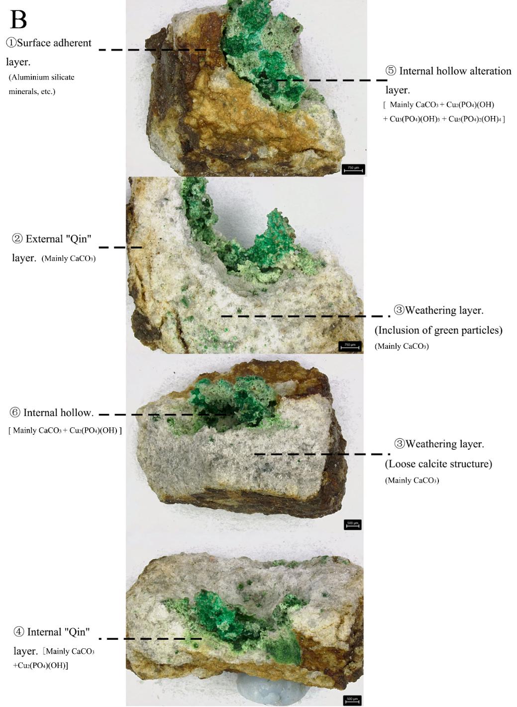 研究表明,坑洞腐蚀结构可分为五层:表面附着物层、表层沁色层、风化层、内部沁色层和内部腐蚀层,各层形貌和物质组成差异显著。腐蚀产物主要为羟基磷酸铜[Cu2(PO4)(OH)]、蓝磷铜矿[Cu3(PO4)(OH)3]和假孔雀石[Cu5(PO4)2(OH)4]。其中,羟基磷酸铜溶解-结晶会持续扩展腐蚀范围,且该过程依赖于埋藏过程中某一时期形成的热液环境,热量来源可能是羟基磷酸铜生成时释放的热量。祭祀坑中埋藏的青铜器、象牙等物品的腐蚀产物在玉器腐蚀过程中起到重要作用,参与并促进了腐蚀发生、发展。该研究结果为大理岩材质玉器文物的保护提供了重要参考。