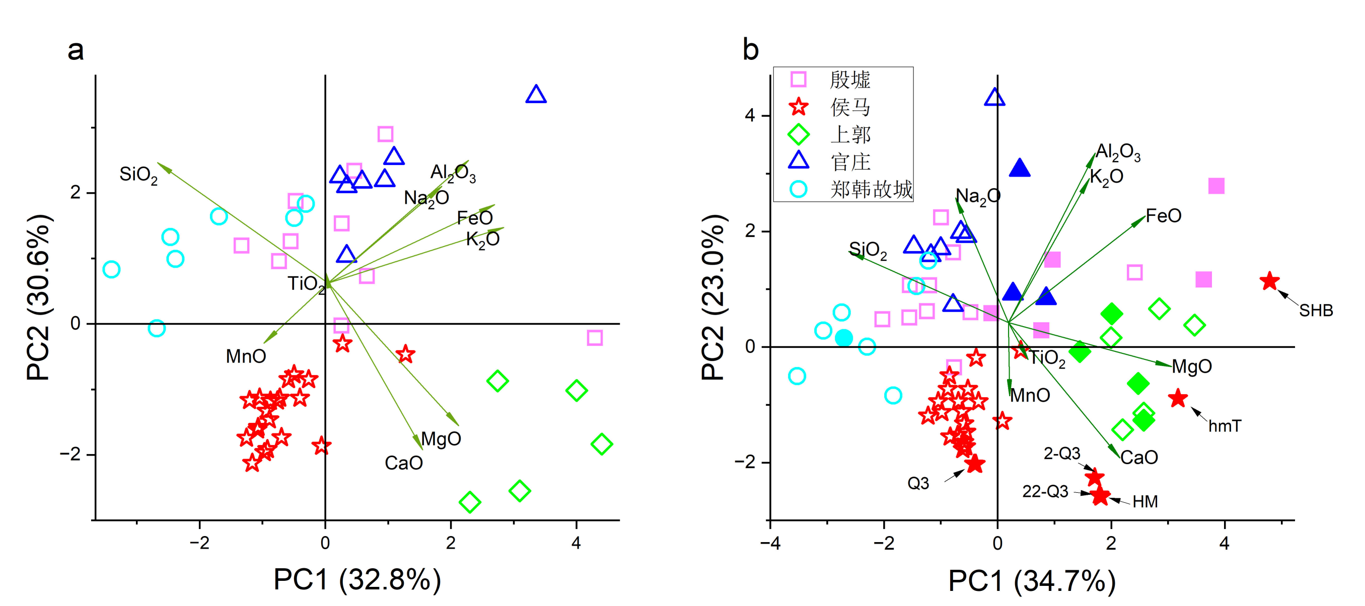 各遗址考古样品和生土样品的地球化学成分的PCA分析(图3)显示,五个遗址陶范材料差异明显,除殷墟陶范外,其它四遗址陶范材料数据点各自聚为一组。殷墟陶范材料数据与官庄和郑韩故城的相近。此结果与岩相分析结果互相佐证。各遗址陶范样品数据与其生土样品数据相近,说明陶范原料均为就地取材。上郭与侯马相邻,两地生土数据相似。上郭陶范数据与两地生土相近,但侯马陶范数据与两地生土差异较大,结合岩相分析观察到侯马陶范粉砂含量多于上郭陶范,颗粒物的粒径总体更大,推测侯马陶范范料是在原有土样的基础上添加了较大粒径的粉砂颗粒。因两遗址位于晋国不同时代的都城,此差异也许体现了陶范材料加工的历时变化。