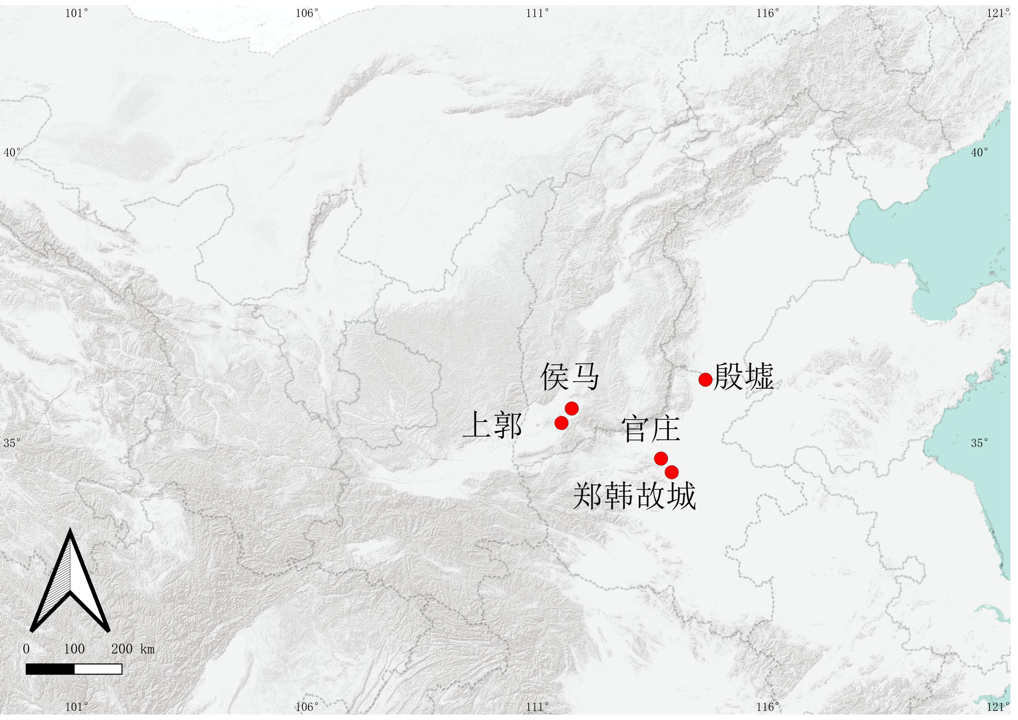 以往研究者们大多关注新出土材料,对某一遗址内材料的分析较为充分,但对不同铸造遗址陶范材料的比较研究却较少。因此为进一步探讨不同遗址陶范材料的差异,以及陶范材料加工的时空变化,本研究借鉴陶器产地研究的方法——岩相分析与化学成分分析相结合,并通过主成分分析(PCA)进行阐释,对中原地区五个重要铸铜遗址安阳殷墟、闻喜上郭、荥阳官庄、侯马白店和新郑郑韩故城(图1)陶范材料进行对比研究。分析样品包括83件陶范(芯),以及其中三个遗址的7件生土样品。