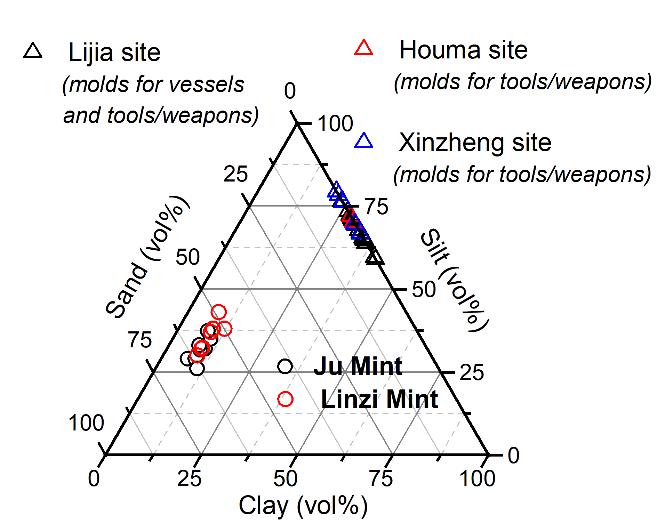 材料分析结果表明,钱范材料主要由砂(极细砂、细砂和少量中砂)组成,而粉砂和粘土含量较少( 图 2 ),钱范的烧成温度超过了1000°C( 图 3 )。与其他类型陶范相比,其材料特征明显不同( 图 4 )。综合细节观察、p-XRF分析和其他考古证据,莒国故城出土钱范很可能存在型腔被刻意磨平后被重新使用的情况(如 图 1 c、d所示)。模拟试验表明,钱范的材料特征使得型腔的刻制非常容易操作。经梳理,含砂钱范不仅在齐国被普遍发现,在易县燕下都、东都洛阳等其他地区也被广泛发现( 图 5 )。由此推断,这一时期,传统的陶范材料已被针对性地大幅改造,具有更好的耐用性和可修复性,以保证钱范可被长期使用。