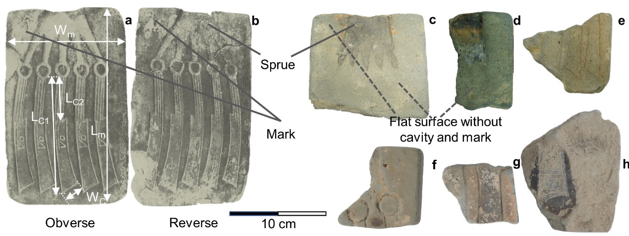 图 1 莒国故城和临淄小城西门外出土完整钱范(a和b)和部分分析样品照片(c-h)