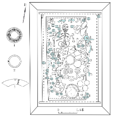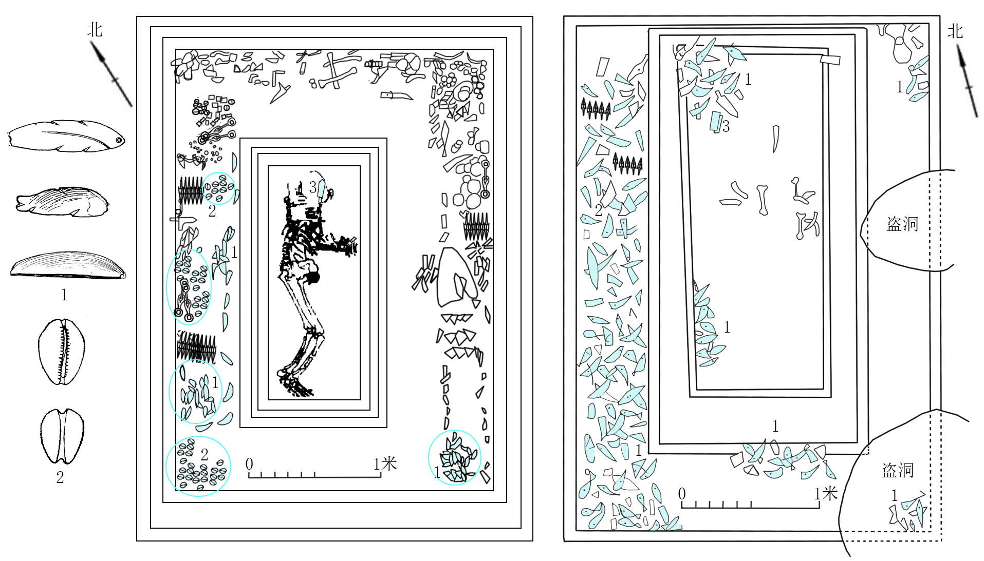 M1:1.蚌鱼 2.蚌贝、海贝 3.石戈(圆圈内表示可能为墓主随葬品或车马器装饰品的蚌鱼、蚌贝、海贝)