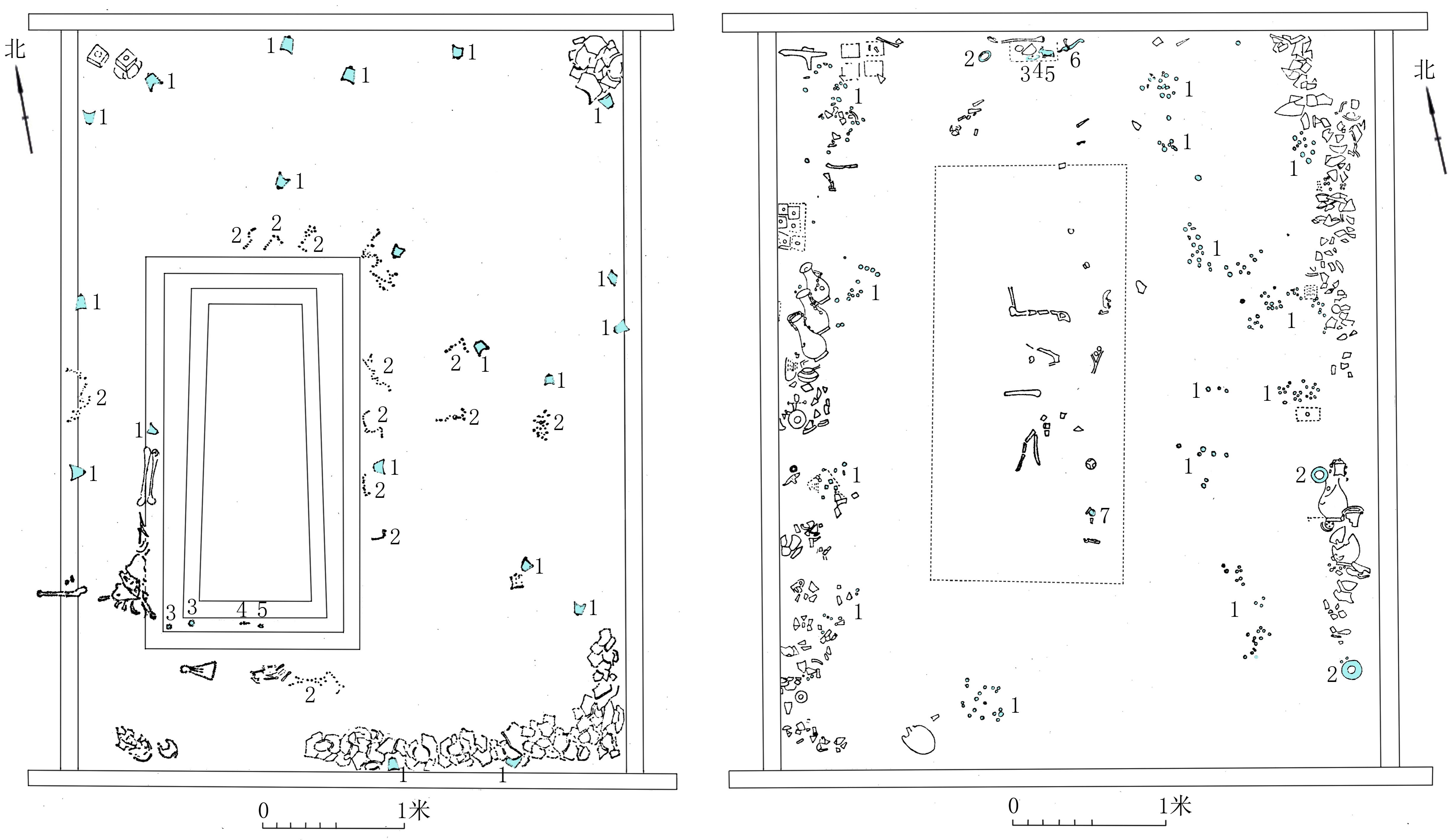 图1 鲁故城M2椁室(左)与M3椁室(右)主要棺椁装饰品出土位置