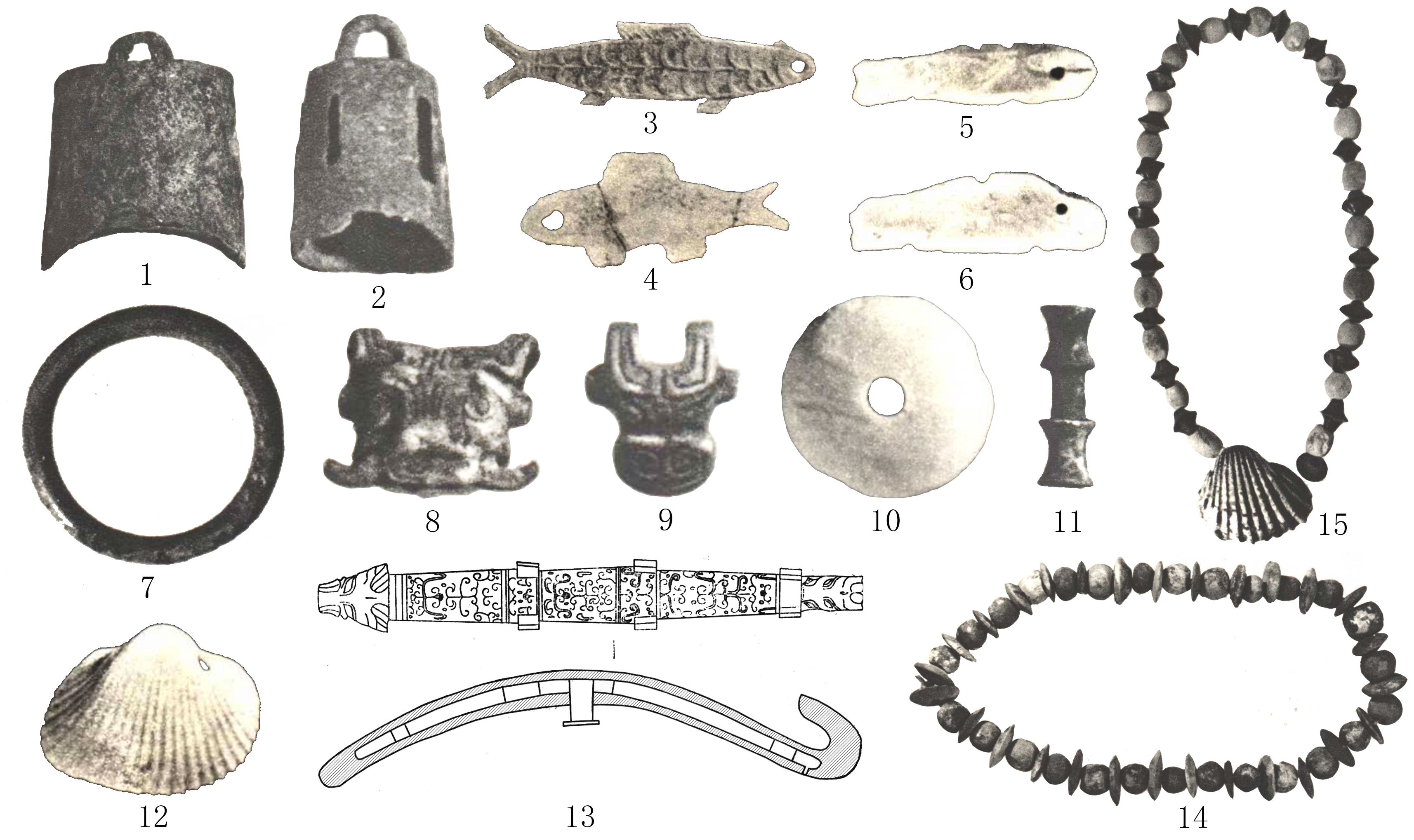 1、2.铜铃(M2:2、M48:41) 3、4:铜鱼(M49:6、M30:14) 5、6:蚌鱼(同号,M30:26) 7.铜环(M30:45) 8、9.铜饕餮头(M48:42、M30:34) 10.铜泡(M48:47) 11.铜细腰(M30:13) 12.蛤蜊壳(M48:45) 13.玉带钩(M3:9) 14、15:骨石串珠(M2:4、M52:114)