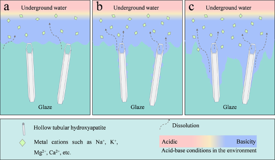 腐蚀过程可分为三个阶段:①表层腐蚀阶段,釉层表面逐渐被侵蚀,暴露内部的管状晶体,使外界环境与管状晶体直接接触,为后续腐蚀创造了条件。②快速深入阶段,管状结构的厚壁引导环境溶液进入釉层内部,导致周围釉层迅速腐蚀,形成空心结构和多个小坑。③扩大连通阶段,随着腐蚀加剧,小坑逐渐扩大并相互连通,最终形成较大的不规则坑洞,管状结构上端脱离釉面,形成倒锥形孔洞。