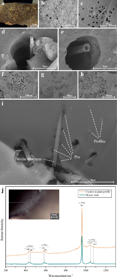 研究认为,邛窑青瓷釉中的管状晶体可能源自羟基磷灰石(Hydroxyapatite),这种物相在高温烧制过程中部分分解并保留了其空心管状六边形结构。这些管状晶体不仅连接了外部环境与釉层内部,还因其表面吸附和离子交换特性加速了釉面腐蚀。该研究成果对于理解传统瓷器的腐蚀机制具有重要意义,并为未来瓷器保护策略提供了重要参考。