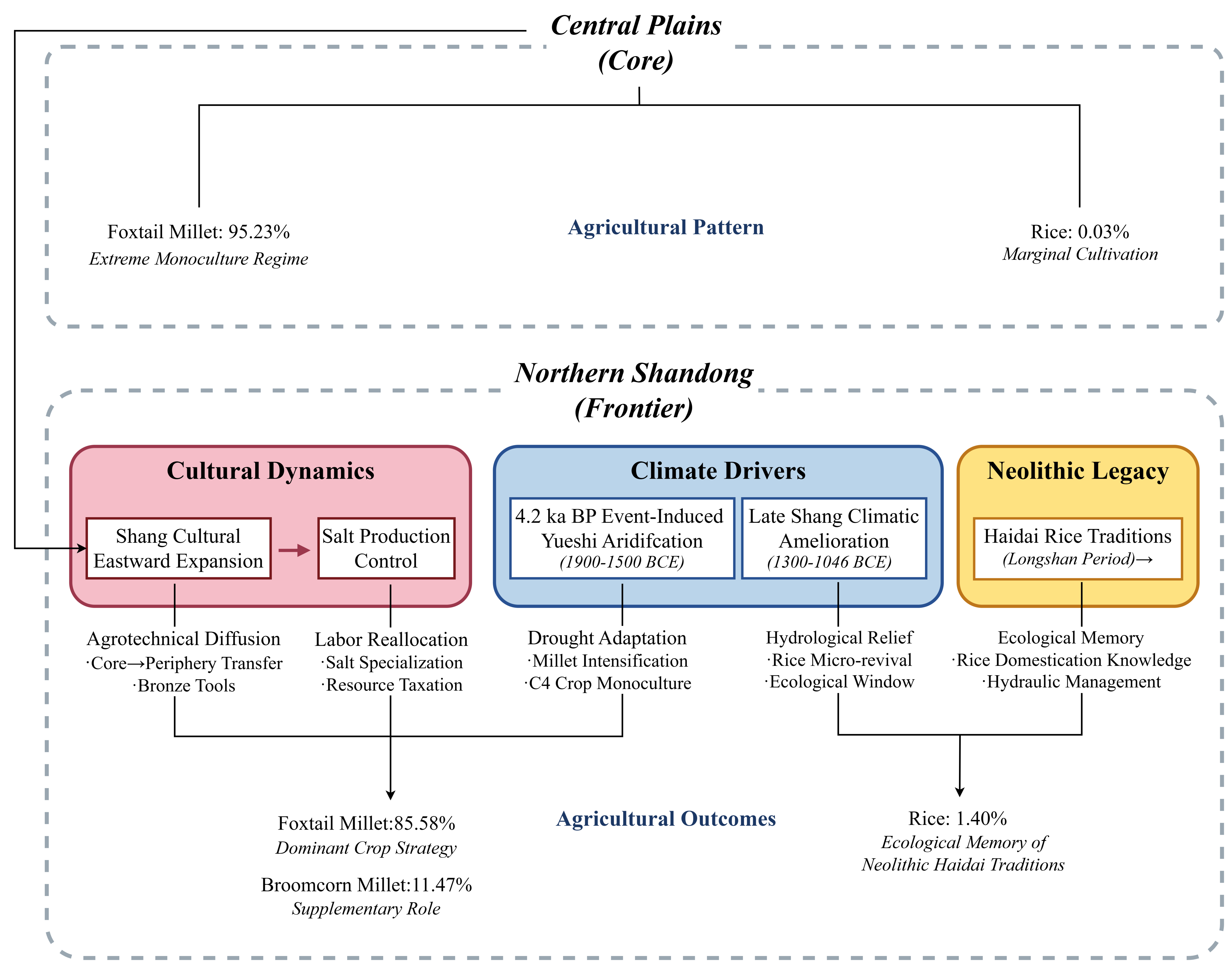 鲁北地区岳石文化至晚商时期的农业转型过程,体现了气候变迁和文化互动的协同作用。4.2 ka BP事件引发的气候干冷化直接推动了岳石文化耐旱作物主导体系的形成,新石器时期的稻旱混作模式被强势旱作农业模式取代。文化因素的渗透则表现为伴随着商文化东扩,中原旱作人口大量迁入,鲁北地区因而延续了旱作农业传统并强化了对粟的种植。然而,中商以来转暖的气候和当地史前稻旱混作农业传统等因素,共同促成部分高等级聚落保持对水稻资源的集约化利用(图五)。此外,微观地理环境差异,如纬度差异导致的热量梯度、水源分布制约的稻作存续,持续影响着不同遗址的作物组合特征。