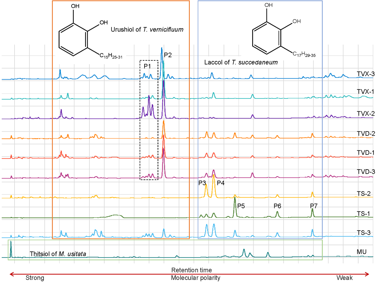 漆的种属鉴定是漆器考古学研究的重要课题之一。然而此前的分析方法仅限于区分源自三个不同物种(T. vernicifluum,T. succedaneum和M. usitata)的生漆,即用热裂解-气相色谱质谱联用(Py-GC/MS)定性鉴定聚合漆酚热解后的产物,该方法的基本原理是三种生漆的漆酚分子结构差异。然而漆树和野漆树因为物种亲缘关系较近,所产的漆酚的分子结构也十分接近,都是混合的邻苯二酚的邻位取代烃基衍生物;而大木漆和小木漆的漆酚分子结构相同,更无法利用Py-GC/MS进行区分鉴定。