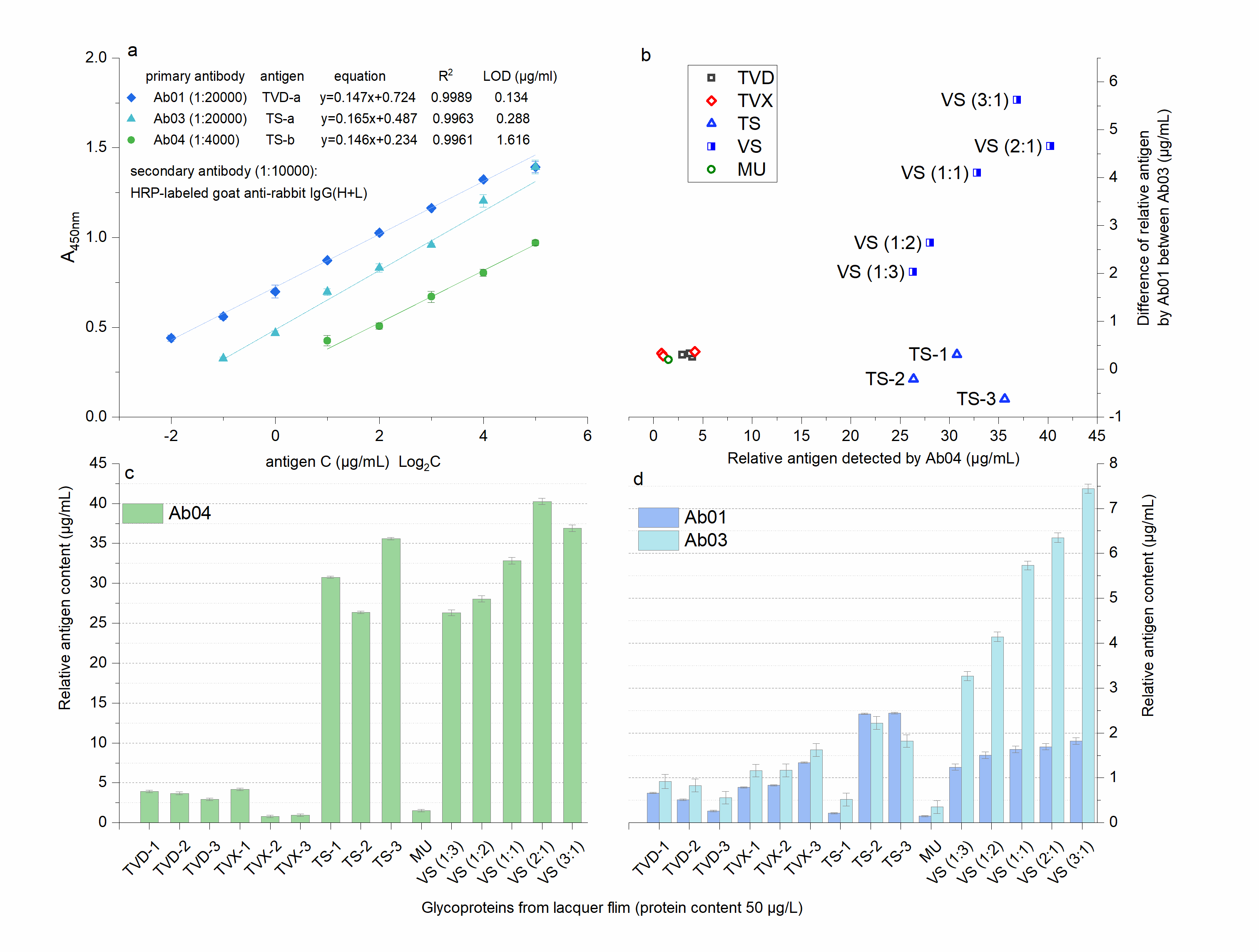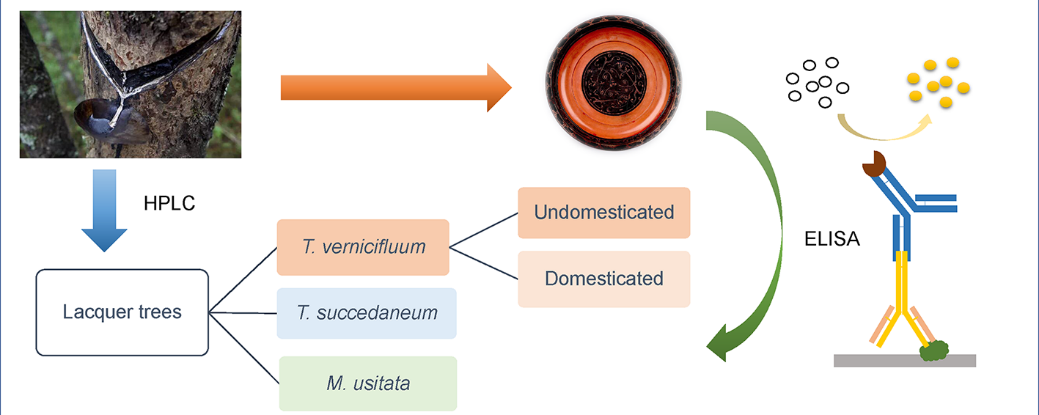 因漆酚聚合后不溶于任何试剂,小木漆和大木漆的漆酚分子差异难以用于漆器文物的鉴定。但是漆膜中的糖蛋白可以被提取分析,于是本研究基于不同生漆的糖蛋白分子差异,研发了特异性抗体,设计酶联免疫定量分析方法,成功地鉴定并区分了不同种属、品种,以及混合漆膜样本。该方法适用于各种条件下出土的漆器文物,仅需要少量漆皮碎片,灵敏快捷,可对大量样本进行统计学分析;为探索古代中国先民驯化漆树的时间和地理范围提供了切实可行的技术方案。