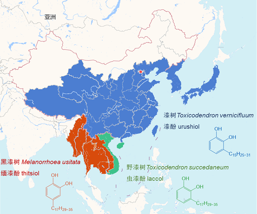 生漆是东亚地区特有的天然高分子聚合材料,是漆树的韧皮部受损后产生的分泌物,主要成分是漆酚、糖蛋白、漆酶和水。在空气中,漆酶会催化漆酚聚合,糖蛋白和漆酶被包裹在聚合物中,聚合后的漆膜具有防水防腐等优良性能。因此,在狩猎采集时代就被古人类利用。
