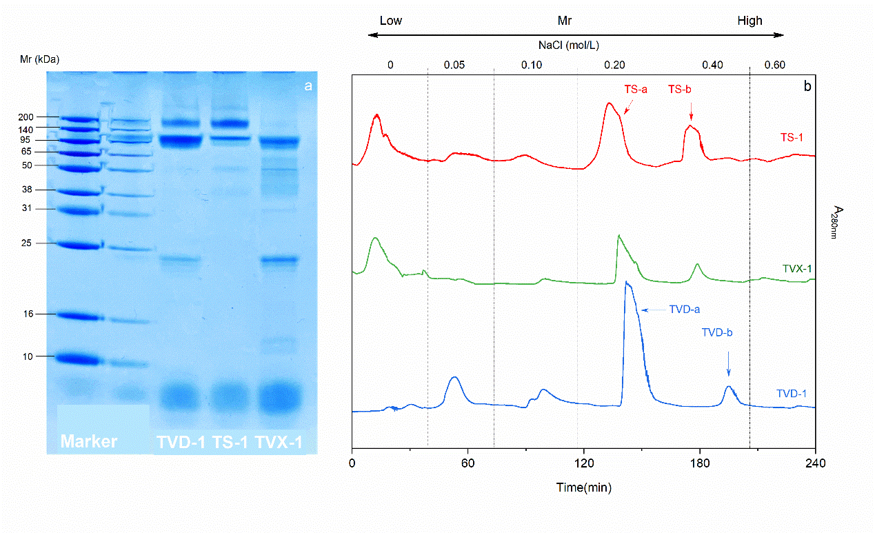 图四 大木漆(TVD)、小木漆(TVX)和野漆(TS)的糖蛋白分子量差异(黑漆糖蛋白含量极低,未提取到可供实验分析的质量)