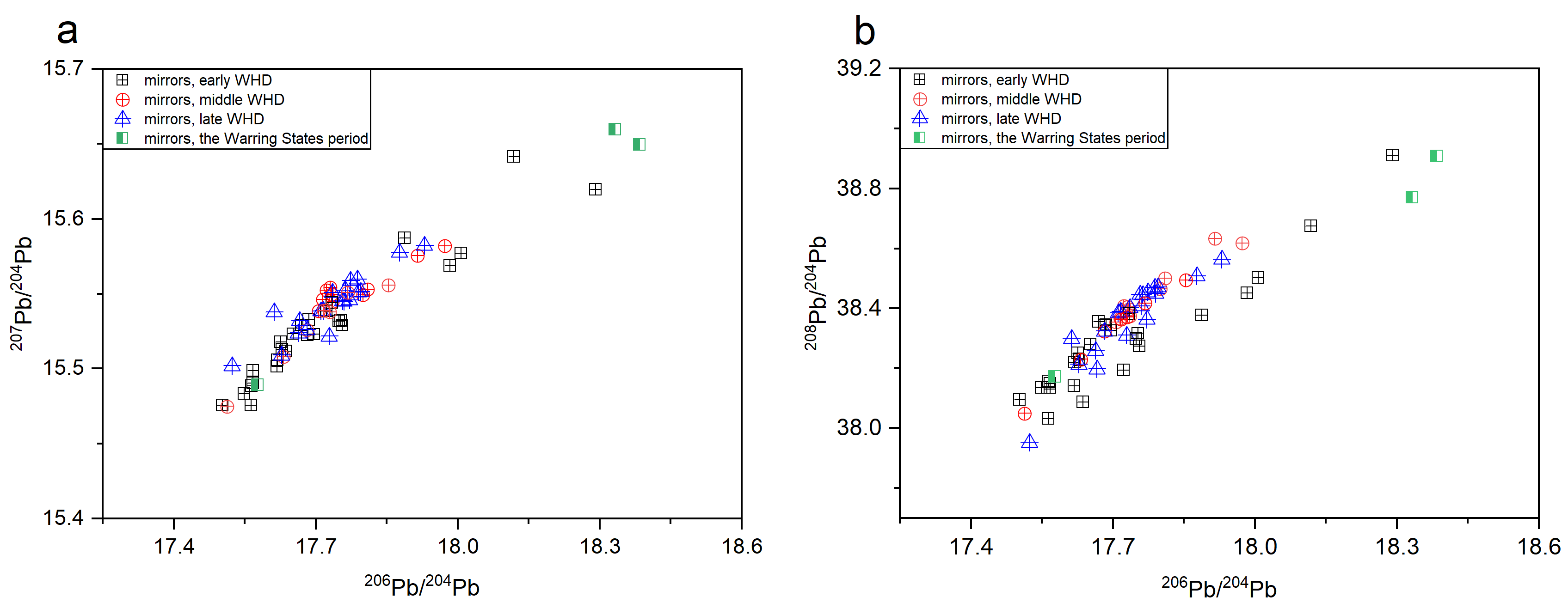 研究表明,战国-西汉时期,临淄出土青铜镜的铅同位素比值存在一定的历时性变化。其中,西汉早期的素面铜镜相较于同时期的纹饰镜,具有较低的kappa值(3.4156 < κ < 4.1941),与临淄出土的战国青铜镜的特征相似,暗示着更早的铸造年代。至西汉中晚期,临淄青铜镜的铅同位素比值分布较为集中(图一)。