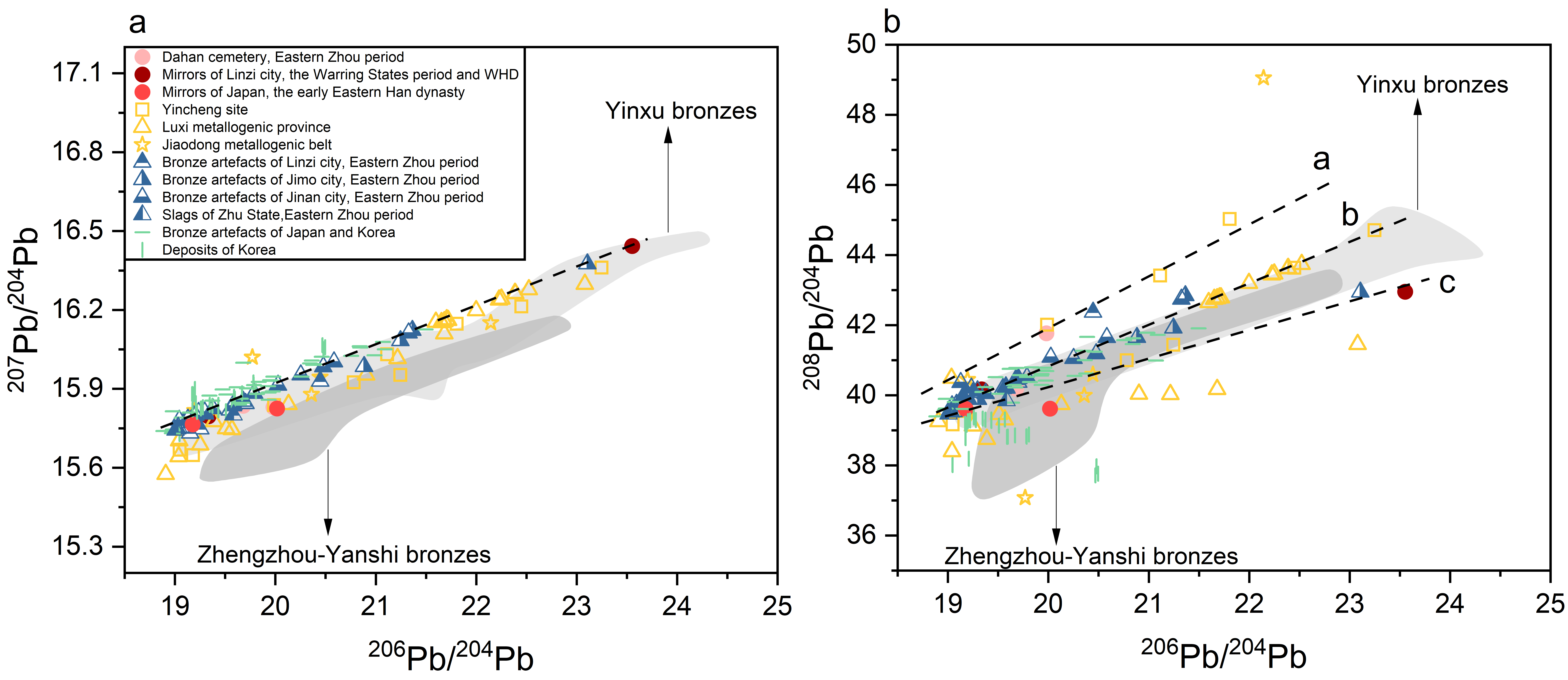 此外,本研究还发现了临淄出土的战国时期的高放射性成因铅青铜镜。通过与山东地区出土的高放射性成因铅铜器、炼渣和矿石的对比研究,认为此类铅料可能是来自于山东地区的鲁西成矿带。此外,对比研究表明,日韩地区发现的高放射性成因铅铜器与韩国和山东地区高放射性成因铅矿山的数据均存在一定的差异,其具体来源仍需进一步讨论(图二)。