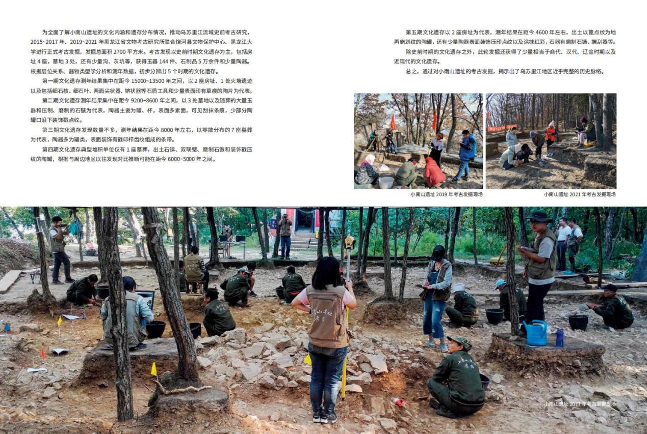小南山遗址是黑龙江省东部地区迄今考古发掘面积最大、年代跨度最长的一处史前时代的遗址。2015-2017年、2019-2021年对遗址进行了正式考古发掘,发掘总面积2700平方米。考古发现以史前时期文化遗存为主,包括房址4座,墓地3处,还有少量沟、灰坑等,获得玉器144件、石制品5万余件和少量陶器。2015年以来在小南山遗址发掘出土玉器140余件,加上以往发现可以确认出自小南山遗址的玉器总数超过200件。这些距今9000年左右的玉器种类包括玦、环、管、珠、璧、斧和各类坠饰,构成了目前所知中国最早的玉文化组合面貌。