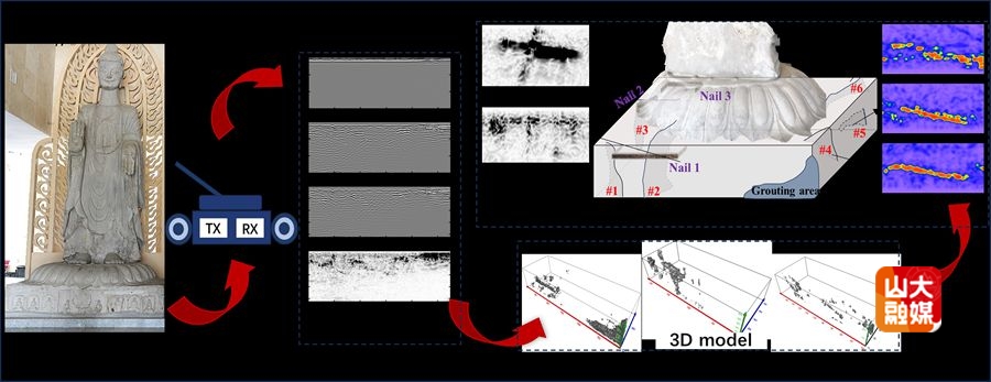 近日,数智考古与中华文明特色分中心、文化遗产研究院李力副教授团队,数智考古与中华文明特色分中心、土建与水利学院工程软件系孙怀凤教授团队与山东省文物保护修复与鉴定中心、青岛市博物馆开展合作,在国际权威期刊Journal of Cultural Heritage在线发表研究论文“Decoding the stone Buddha: Three-dimensional ground penetrating radar attribute insights into cracks and restoration history of Sumeru throne”(JCR Q1、中科院艺术学一区)。土建与水利学院博士研究生葛峻恺为第一作者,孙怀凤教授、李力副教授为本文的共同通讯作者,山东大学为第一科研单位。