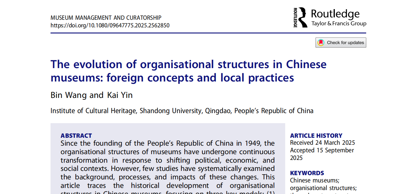 近日,山东大学文化遗产研究院在国际期刊Museum Management and Curatorship上在线发表了题为“TheEvolution ofOrganisationalStructures inChineseMuseums:ForeignConcepts andLocalPractices”的学术文章。文章第一作者为文化遗产研究院博士研究生汪彬,通讯作者为尹凯教授。