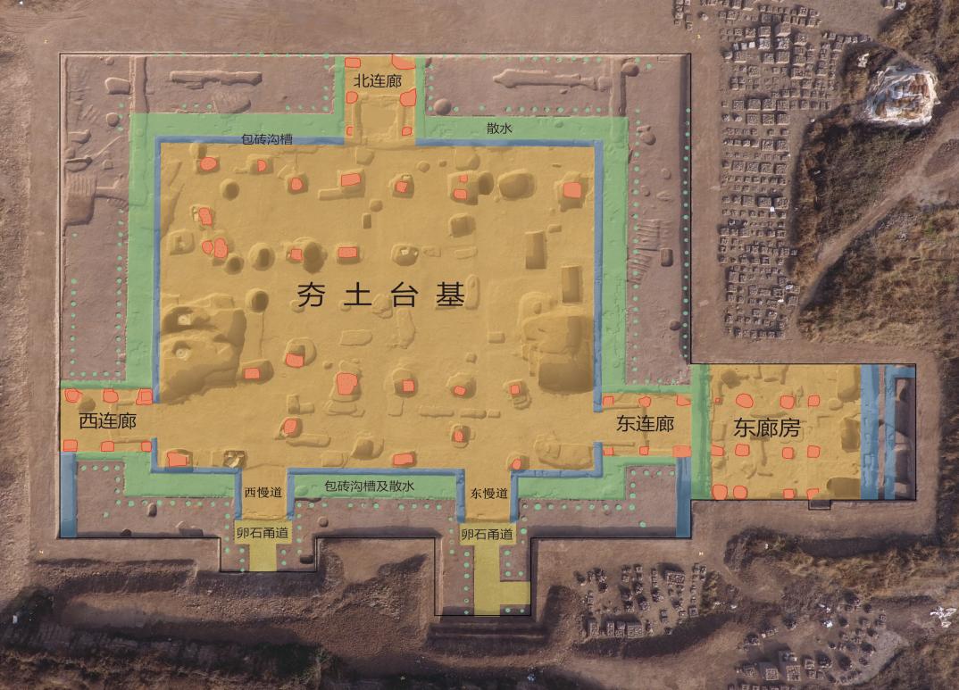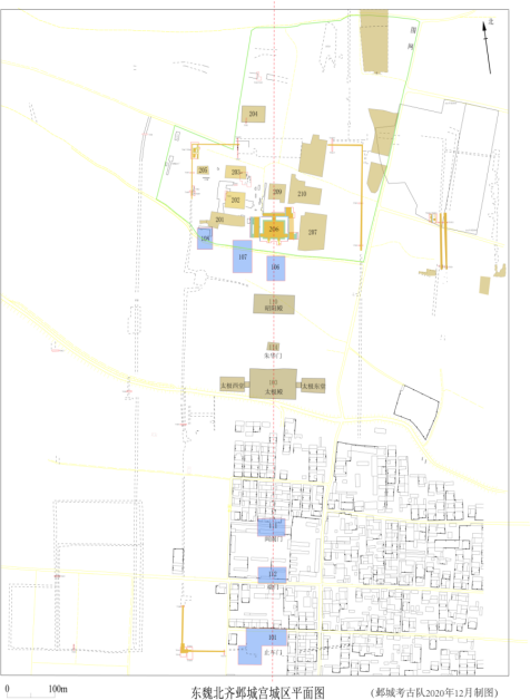 206号大殿面阔约42米,进深35米,面阔七间,每间按面宽5.2米设计。东西连廊连接两侧廊房,均为进深两间。北部有复廊。整个主体建筑为廊道环绕,南侧有东、西两条踏道和卵石铺成莲花图案的甬道。大殿东北部以复廊为界,分为206号大殿东侧廊房的北端和209号大殿东侧廊房的南端,形成曲尺形拐角,其间有一道东西向隔墙。[3]206号大殿夯土基槽分为早晚两期,早期为东魏时期,以夯土为主;晚期则呈现出北齐时期对原建筑改建、扩建和重修的特征,采用夯土和碎石块分层叠筑的方式,以增强承重力。在206号、209号大殿基址范围内出土各类板瓦、筒瓦、莲花纹瓦当、兽面纹瓦件以及础石、铺地石、铭文砖等高级别的建筑材料和宫廷器具,极大地丰富了对北朝晚期工艺技术的认知。