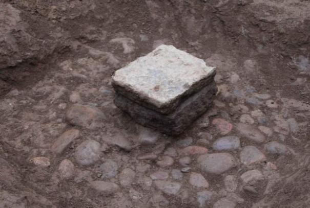 核桃园大庄严寺遗址的发掘以中心塔基为重点,通过对塔基中心的解剖,发现有与舍利埋藏相关的遗迹。何老师简要介绍了石函的瘗埋情况。石函通体较为粗糙,函身边缘四角刻有字迹,可辨认有“三”“宝”字样。石函内包含物种类繁多,除大量腐蚀的有机质残迹之外,还有各种质地的管、珠、坠饰、圆形和椭圆形石饰、铜钱、铜饰件及玻璃器残片、钟乳石残段等。石函周边还发现五个青釉罐,内见有“常平五铢”铜钱,以及高纯度的碳酸钙粉末,推测与珍珠、琉璃、砗磲等佛教七宝供养相关。[4]