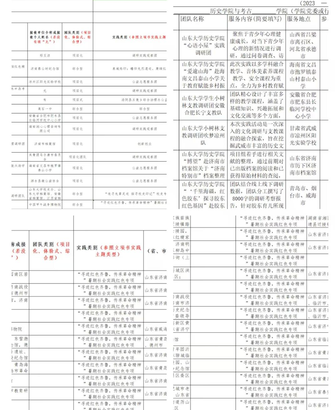 开展国情调研,服务奉献社会。山东大学历史学院关于青少年创伤应对与幸福追寻心理调研团调研青少年的心理创伤问题,并给出可行性建议;山东大学历史学院“笃行”社会调研团队对学生群体性健康教育现状进行调查;山东大学“悟茶韵·品菓色”社会实践团队开展茶文化与茶点文化宣讲活动,旨在传承和弘扬这一优秀传统文化,促进社会和谐发展;山东大学历史学院“路在脚下”社会实践队深入基层、走进乡村,探访革命旧址、参观科技园区,在社会实践中厚植家国情怀;山东大学历史学院“知行合一”实践探索小队基于“万企兴万村”调查研究民营企业,助力打造数字乡村齐鲁样板;山东大学历史学院“博望”赴济南市档案馆关于“济南特别市”档案整理调研团以济南市档案馆的“济南特别市”档案为基础,主要对其进行史料整理研究,同时总结“济南经验”;山东大学007足球比分