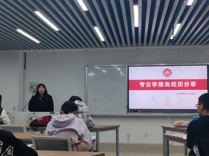 考古学专业的刘索焓学姐。刘索焓学姐为同学们仔细的讲述了考古学专业保研的具体流程与时间线,向学弟学妹们介绍了考古文博类可报考的院校以及面试的注意事项,还特别强调了在文书材料准备时善于利用各类软件的重要性。