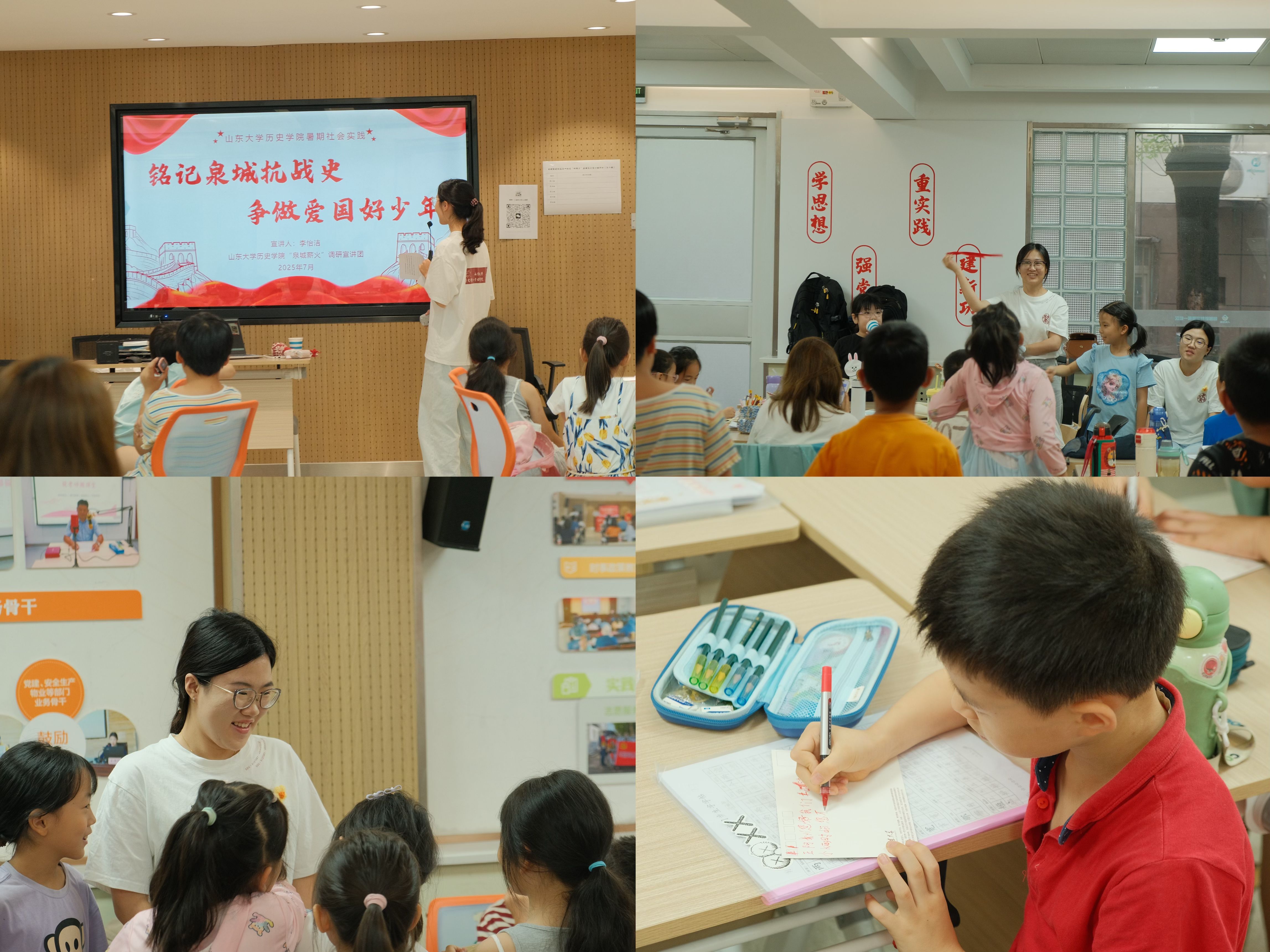 “泉城薪火”调研宣讲团走进济南历下区甸柳新村第一社区,为小朋友们带来一场特色济南抗战历史宣讲。教学以“小石头的日记”为线索层层展开,并设置“我是小小侦察员”“米汤显影传秘信”等互动环节,盘活红色资源,让学生在兼具严谨性与体验感的活动中铭记峥嵘岁月、传承红色精神。