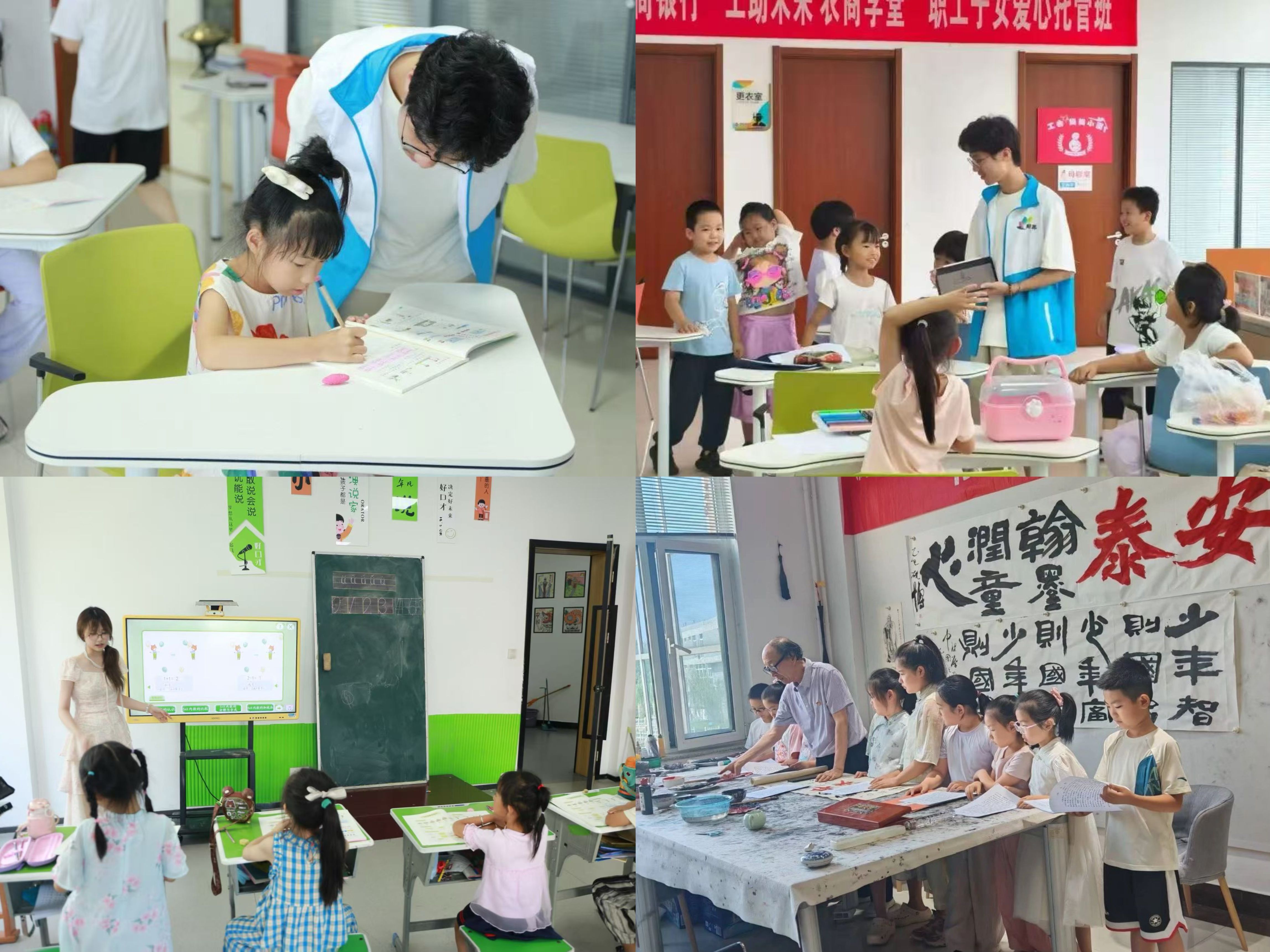 “萤窗共话”实践队加强与社区的联动配合,前往爱心托管班、安泰社区、府前社区同步开展支教活动,在课业辅导50余名巩固学科知识的同时,开设折纸、绘画、书法、科普实验等趣味课程,让中华优秀传统文化在更多孩子们心中生根发芽。