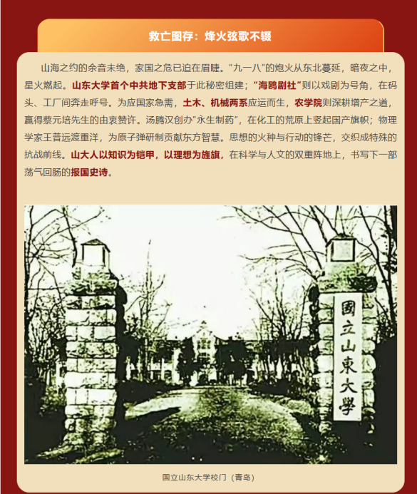 推出《史海钩沉·抗战中的山大史诗》原创栏目,整理回顾抗战中的烽火岁月,深刻感悟学校在抗战烽火中辗转办学、弦歌不辍的历程,激励学子厚植爱国爱校情怀,积蓄砥砺前行的勇气与力量。